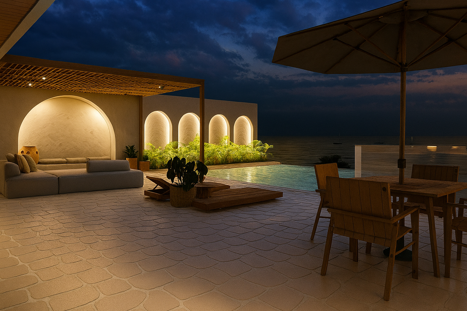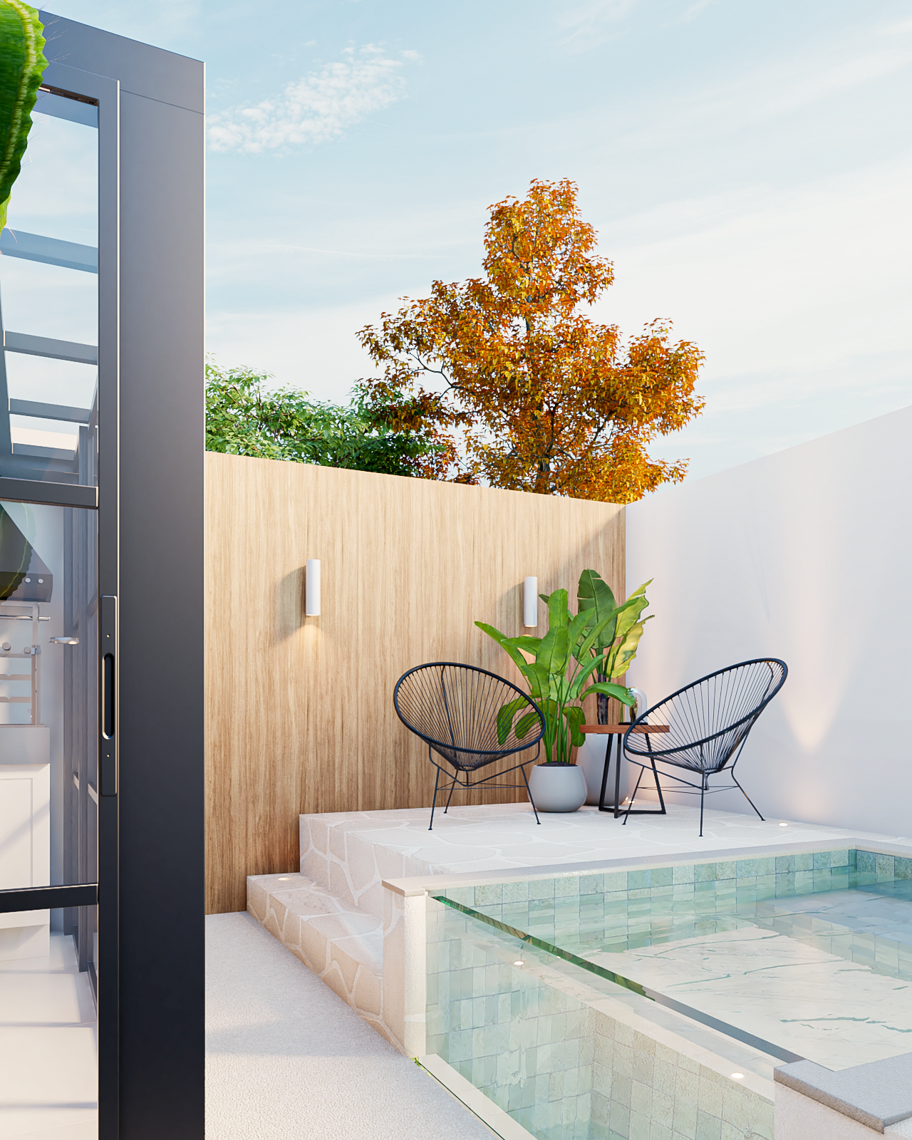 Define mobiliário, iluminação, revestimentos, cores e decoração.