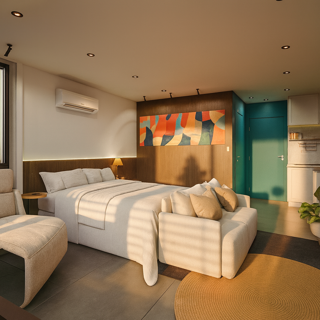 A ambientação transforma o espaço pronto em um lar vivido e acolhedor.